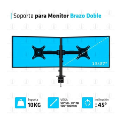 Soporte Kanji para Monitores de 10 a 27 pulgadas con brazo doble, está desarrollado en acero y soporta hasta un peso máximo de 10 kg. Cuenta con máxima flexibilidad para su instalación y es compatible con el estándar de montaje Vesa 50 x 50mm, 70 x 70mm, 100 x 100mm.